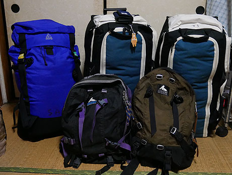 後の左にある青い90Lザックは、まだ詰め込み途中で、13kgくらい。